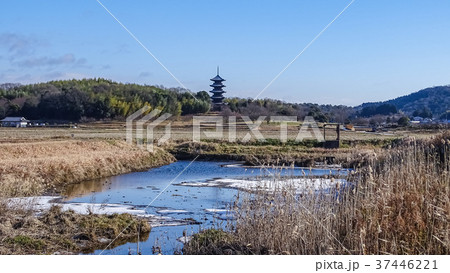 日本、岡山県、総社市、備中国分寺の五重塔の四季、冬のため池
