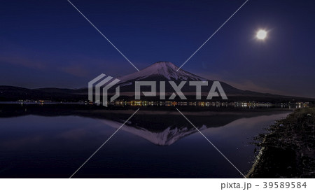 日本、冬の富士山、絶景、夜の山中湖にて