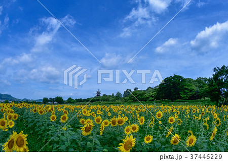 日本、岡山県、総社市、備中国分寺の五重塔の四季、ヒマワリの花