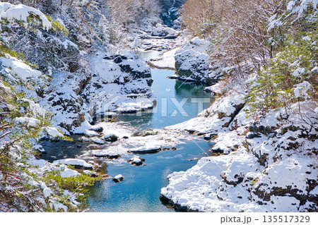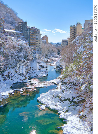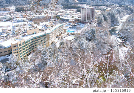 栃木県日光市 冬の雪積る鬼怒川温泉と鬼怒楯岩大吊橋