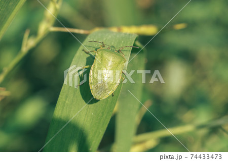 Close Up of linen skin stink bug on the green leaf, The brown marmorated stink bug is an insect in the family Pentatomidae..Nature background pattern texture for design.