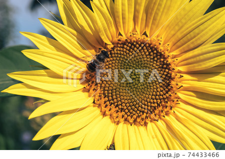 Beautiful sunflower and bee on a nature background. Sunflower field blooming during the Summer.