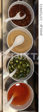 Chili flake sugar sliced chili chili sauce condiment seasoning Four white bowl display chili flake sugar sliced chili chili