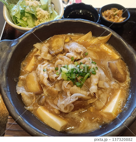 Japanese hotpot, pork, tofu, mushroom, green onion, soup comfort food steaming savory
