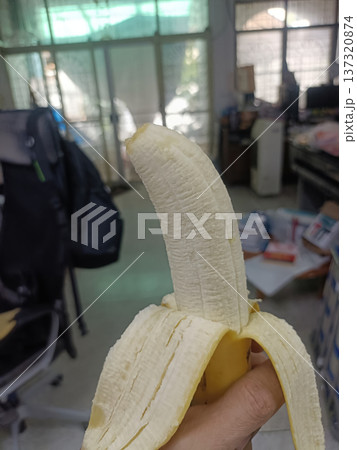 Peeled banana human hand indoor office natural light casual snack healthy food yellow fruit morning break peeled banana held