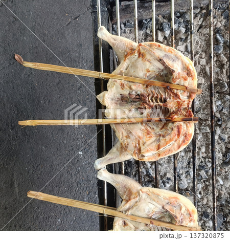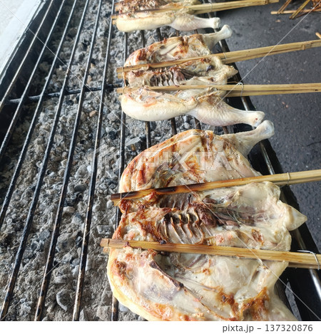 Grilled chicken bamboo skewer street food charcoal grill local cuisine traditional cooking outdoor cooking rustic meal grilled