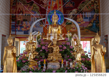 Nonthaburi, Thailand, March 15, 2025, Buddhist altar with golden and seated figures in Wat Chomphuwek