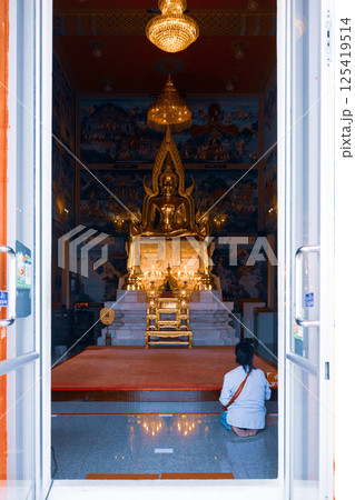 Nonthaburi, Thailand, March 15, 2025, Visitors pray in front of the majestic Buddha statue inside Wat Chomphuwek temple
