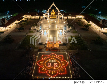 Chonburi, Thailand, Febuary 12, 2025, Buddhist altar adorned with candles and flowers at Wat Hupbon Wanaram induring offerings
