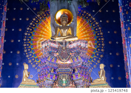 Chonburi, Thailand, Febuary 12, 2025, Buddha statue surrounded by colorful serpents at Wat Hupbon Wanaram