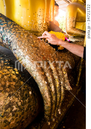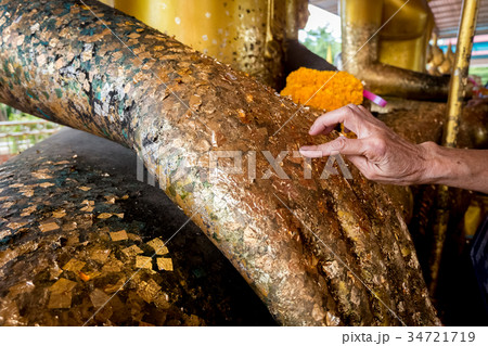 Female hands are gilded Buddha statue
