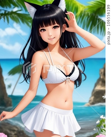 黒いビキニの猫耳女の子、二人が向かい合っている
