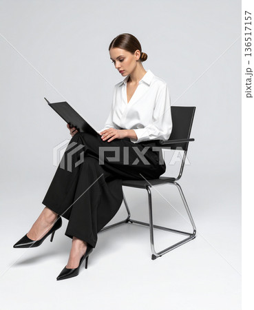 黒のハンドバッグを持つ女性のエレガントなファッションポートレート