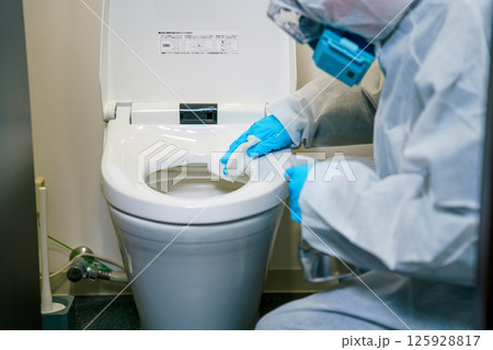 トイレを消毒する清掃業者