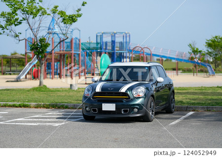 公園の駐車場に停まるミニクロスオーバー