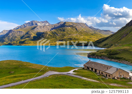 A panoramic view of the Mont Cenis Lake and French Alps under beautiful sky.