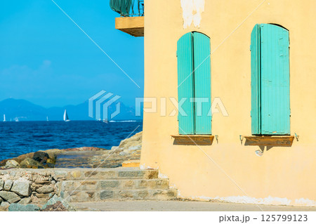 A yellow walled building with vibrant turquoise shutters overlooks the azure waters of Saint-Tropez.