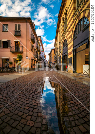 Cobblesone street among buildings under blue sky with white clouds in old town of Alba, Italy.