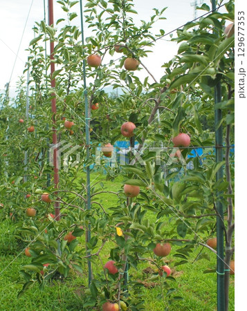 高密植栽培のリンゴの木になっている、熟し始めのりんご、シナノリップ