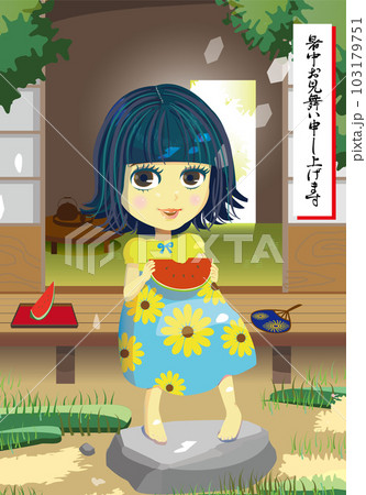 古い和風の家でスイカを持った少女の暑中見舞いイラスト