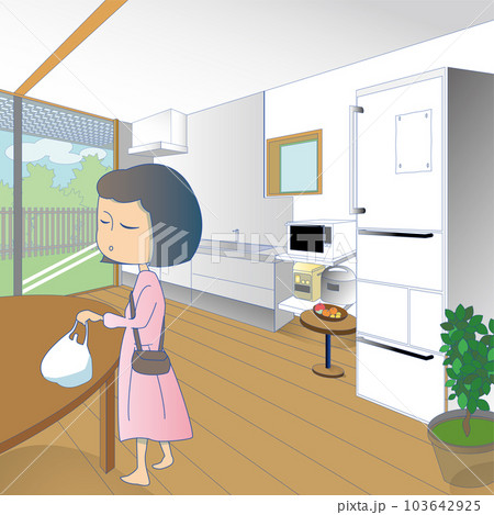 買物から帰ってきてキッチンに荷物を置く女性のベクターイラスト