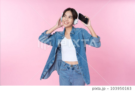Young Asian woman wearing headphones dancing and listening to music from smartphone shoot in isolated on pink background
