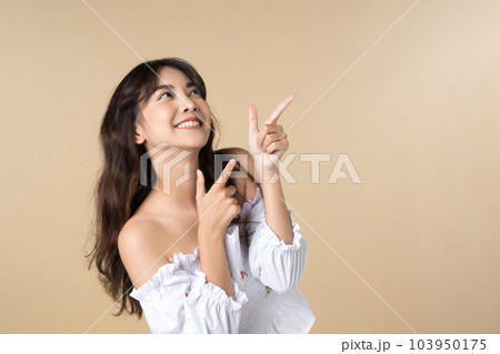 Young Asian woman pointing fingers up to empty space isolated brown color background