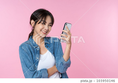 Portrait of young Asian woman using smartphone isolated studio pink background