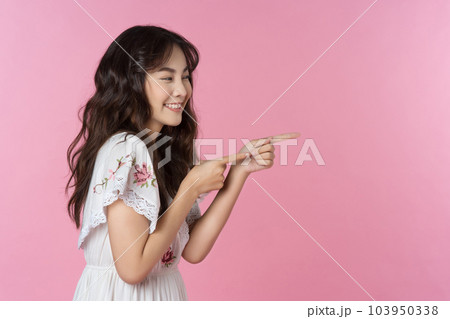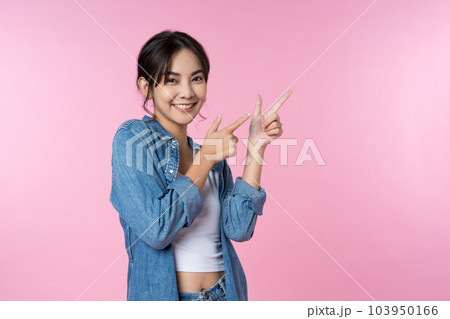 Young Asian woman pointing fingers to empty space isolated pink color background