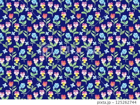 水彩で描いたビオラのイラスト シームレスパターン素材 背景ネイビー