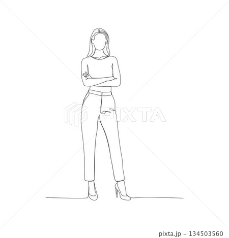 Hand-drawn woman in modern trousers. Manual vector with editable paths. Confident pose, minimalist fashion sketch