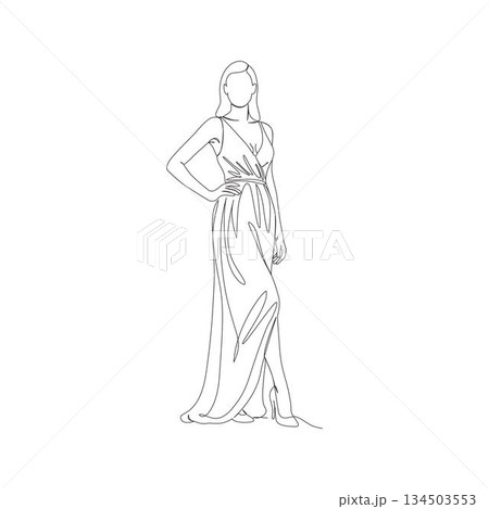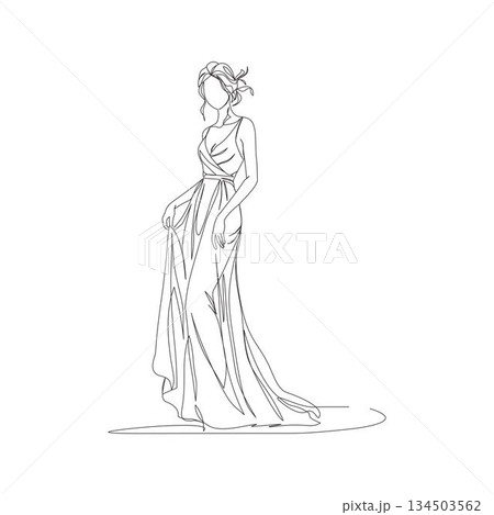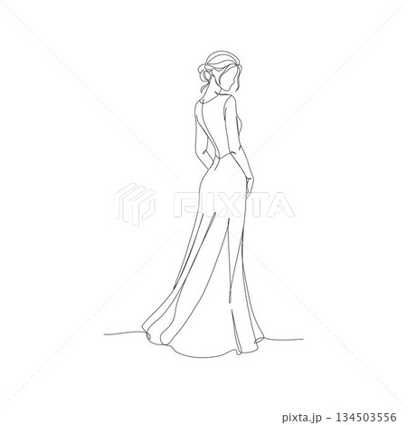 Hand-drawn woman in slim fit gown. Manual vector with editable paths. Minimalist fashion line art.