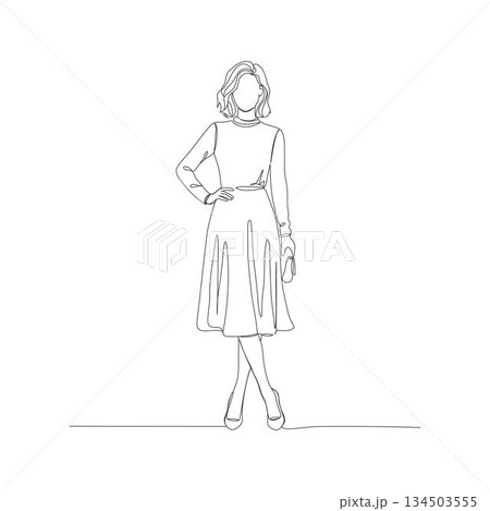 Hand-drawn woman in belted dress. Manual vector with editable paths. Professional minimalist line art illustration