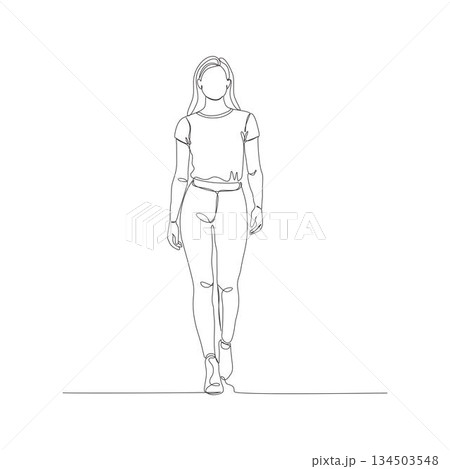 Hand-drawn woman in modern trousers. Manual vector with editable paths. Minimalist fashion line art.