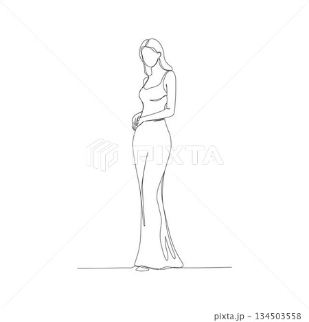 A continuous one-line illustration of a pregnant woman standing elegantly, holding her baby bump