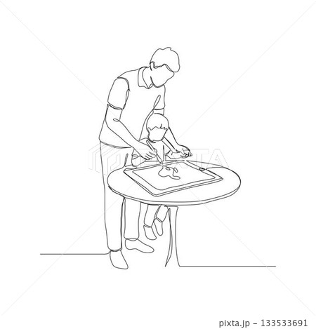 Flat Color Line Art Illustration of a Father and Child Drawing Together