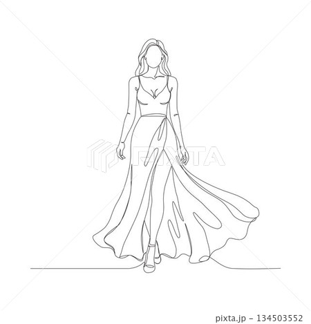 Hand-drawn woman in slim fit gown. Manual vector with editable paths. Minimalist fashion line art.