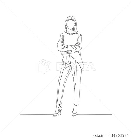 Hand-drawn woman in modern trousers. Manual vector with editable paths. Confident pose, minimalist fashion sketch