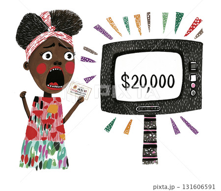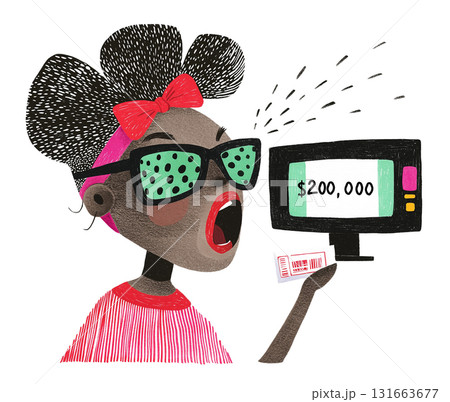 A woman screaming in shock as she sees her winning sum on the TV screen. The black lady holds the ticket, thrilled by her sudden stroke of luck. AI-generated illustration
