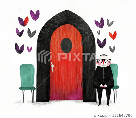 An elderly man sits alone on a chair near a closed door, quietly waiting in a lobby. A tired visitor rests in silence, hoping the wait wont last much longer. AI-generated illustration
