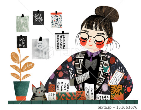 A young woman with glasses and a bun smiles while working at her messy desk filled with papers and cards. A cat sits nearby as she stays happy in her creative office space. AI-generated illustration