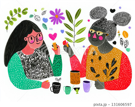 Two young women sit together, smiling and sipping tea from mugs, enjoying cookies and conversation. The friends laugh and have fun during a cozy brunch. Simple AI-generated illustration