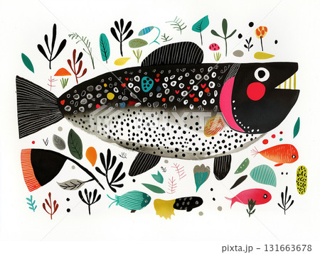 A group of colorful fish swim together underwater, surrounded by plants and leaves. Big and small fish move side by side in their natural habitat. Simple AI-generated illustration