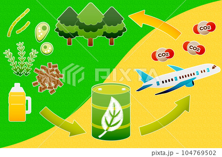 SAF-持続可能な航空燃料、ジェット機と二酸化炭素、植物由来のエネルギーのイラスト(シンプルカラー)