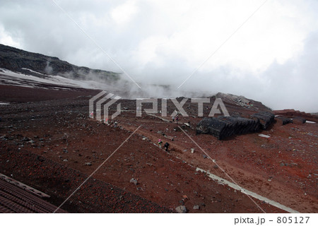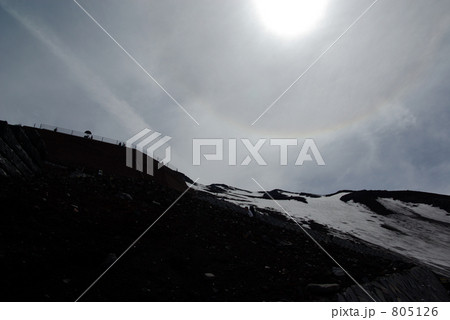 富士山頂の鳥居と残雪