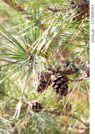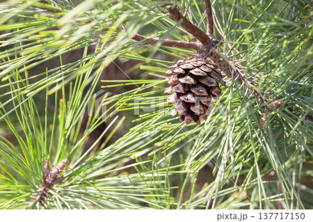松ぼっくりのある松の木のクローズアップ。明るい松の木の風景