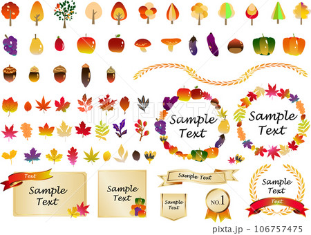 秋の素材のアイコンとフレームとカードとリボンのイラストセット