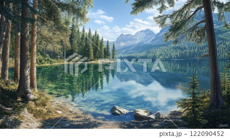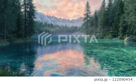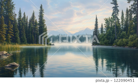 Morning lake with clear water in a pine forest