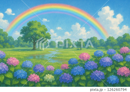 梅雨の晴れ間と虹がかかる公園と紫陽花の風景