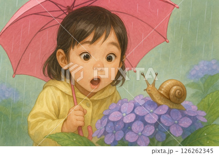 梅雨の時期、紫陽花のカタツムリに驚く女の子